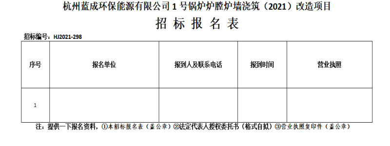 杭州蓝成环保能源有限公司1号锅炉炉膛炉墙浇筑(2021)刷新项目招标通告