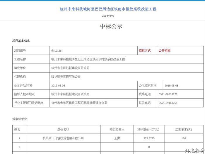 2019年5月5日上午9:30,在余杭公共资源生意中心1号开标室,杭州未来科技城阿里巴巴周边区块雨水排放系统刷新工程果真招标开标,共有65家单位加入投标。经评标委员会评审,投资公司依附自身实力和合理报价乐成中标。