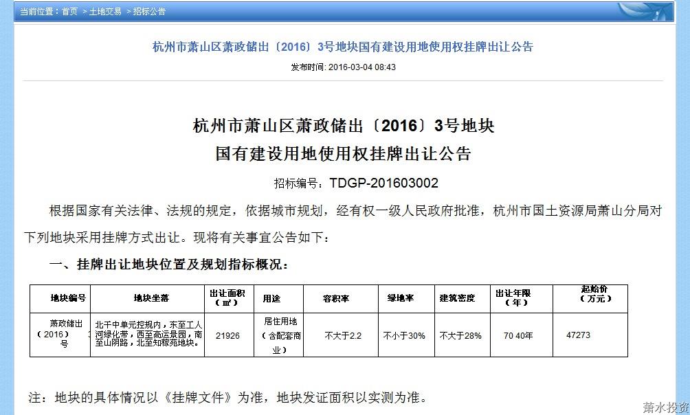 3月4日,投资公司肩负的北干街道棚户区刷新项目E-3地块以萧政储出〔2016〕3号地块命名,正式在萧山区招投标治理信息网上宣布国有建设用地使用权挂牌出让通告,妄想在4月5日完成挂牌竞价。