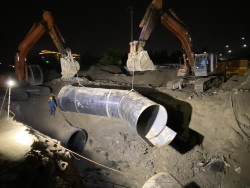 该DN2000管是新塘泵站至钱江水处置惩罚厂主干管,迁改总长为535米,割接点共有2处,一处位于竞汇路与学知路交织口西南侧,另一处位于学知路与知行路交织口东南侧。施工时代,萧山主城区新塘街道和南片临浦、义桥等9个镇街阻止污水运送。